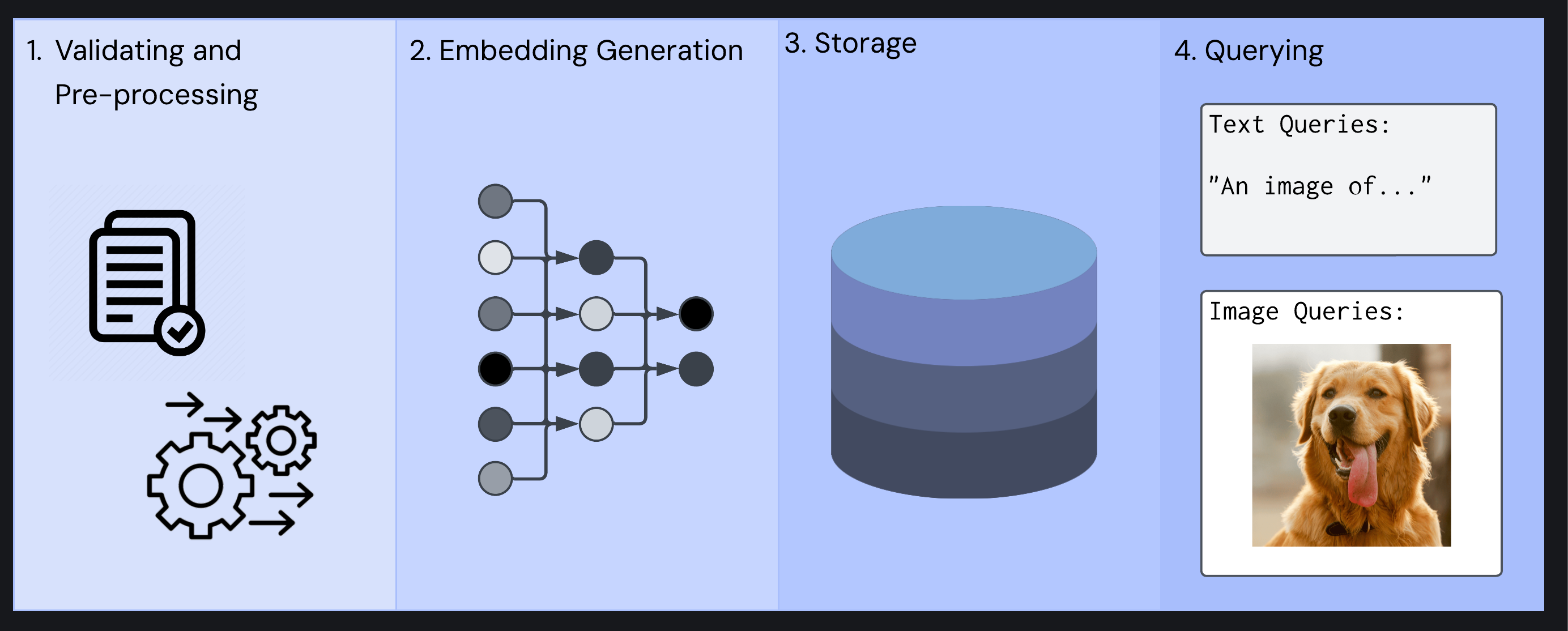 Modern businesses often accumulate vast image collections. Existing search functionality typically relies on associated text data like titles and descriptions. However, users now expect more intuitive search capabilities - searching by uploading similar images, using nuanced text descriptions, or combining both. With computational costs steadily declining, implementing multimodal embeddings has become increasingly viable from a business perspective and would dramatically improve search capabilities. However, it requires addressing several interconnected technical challenges: validating and pre-processing input data, generating embeddings, storing embeddings, and querying stored embeddings. The following sections will break down each of these challenges in more detail.